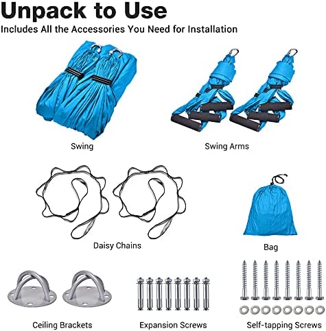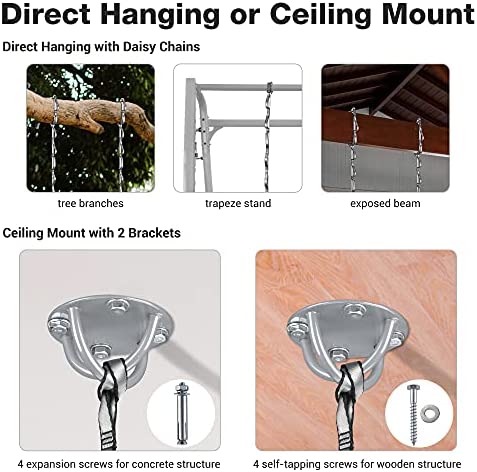 – Direct Hanging or Ceiling Mount – with 2 daisy chains for directly hanging the swing on tree branches, trapeze stand, exposed beam or other solid structures; fast to change the seat height by hanging the seat on higher or lower loops on daisy chains; With 2 ceiling brackets & 2 kinds of mounting screws for mounting on concrete or wooden ceiling