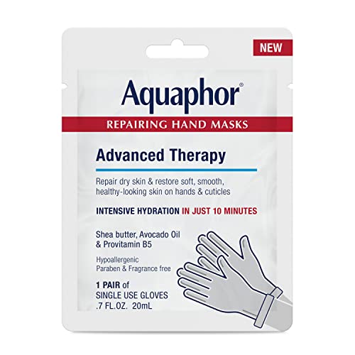Aquaphor Repairing Hand Masks deliver intensive hydration to dry hands in just 10 minutes. These moisturizing gloves are easy to use and mess free for a convenient self care treatment at home or while traveling. The repairing hand masks are also fragrance free and help restore soft, smooth and healthy-looking skin on hands and cuticles. Designed to repair dry skin, the hand moisturizer gloves offer a gentle formula to help revitalize, relieve and replenish dry hands, so you can look and feel your best. The conditioning and moisturizing gloves for dry hands are infused with a blend of avocado oil and shea butter along with Aquaphor’s signature ingredients: Provitamin B5, Glycerin and Bisabolol. For the ultimate hand care, add these moisturizing gloves to your self care routine to enjoy healthy-looking skin. Tear the sachet at the notch, remove gloves from the sachet, unfold them, and gently pull gloves apart at the wrist seal. Slip the hand repair moisture gloves onto your hands, and leave them on for at least 10 minutes. Remove the hand masks and massage any excess product into skin—there is no need to rinse hands after use. Each of the ingredients in Aquaphor skin care products are tested and approved for their quality and safety, and suitability for dry, sensitive skin.