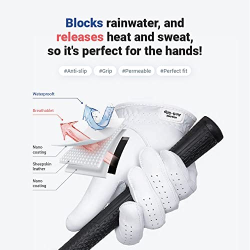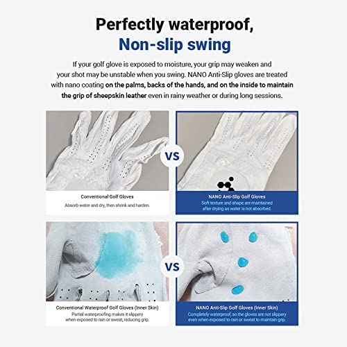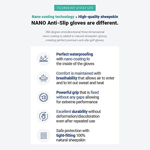 * Perfect waterproof treatment provides non-slip swinging power. When golf gloves are exposed to moisture, the grip strength is weak and the shot may shake during swing. This product has been treated with nano coating on the palms, backs of hands, and inside surfaces to maintain the grip of sheepskin leather even in the rain or for a long time rounding.