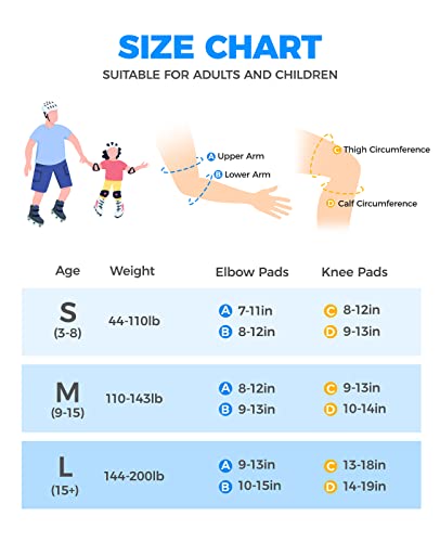 ✪【Adjustable Size】2pcs knee pad, 2pcs elbow pad, 2pcs wrist pad, Size: S Suggest for 3-6 year old. M, Suggest for 7-14 year old, L, 15 to adults, Magic stick to modify the size. (Please check our size chart in the detail picture)