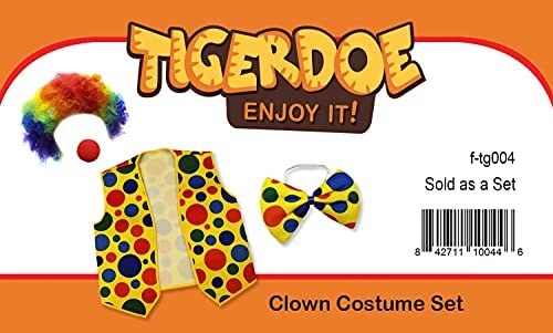 Be the first to review “Clown Costume – Clown Nose Clown Wig Bow Tie and Vest – 4 Pc Clown Dress Up Accessories by Tigerdoe”
