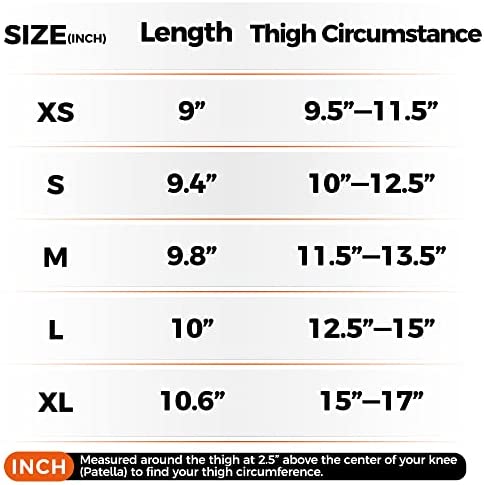 XS for Kids: Thigh Circumference: 9.5-11.5 inches, Length 9 inchesS for Kids: Thigh Circumference: 10-12.5 inches, Length 9.4 inchesM for Kids/Youth: Thigh Circumference: 11.5-13.5 inches, Length 9.8 inchesL for Youth/Women: Thigh Circumference: 12.5-15 inches, Length 10 inchesXL for Men/Women: Thigh Circumference: 15-17 inches, Length 10.6 inches