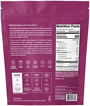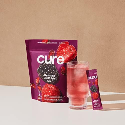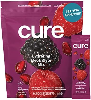 Cure Hydrating Electrolyte Mix | Powder for Dehydration Relief | FSA & HSA Eligible | Made with Coconut Water | No Added Sugar | Vegan | Paleo Friendly | Pouch of 14 Packets – Berry Pomegranate