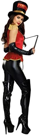 Rich red velvet top with gold fringed epaulets, lion head buttons and gold sequin trimmed peplum. Includes stretch leggings, top hat and belt with lion head buckle. (Gloves, whip and jewelry not included.) (four-piece set)