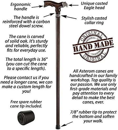 This eagle head cane for men is carved of hardwood oak, smooth sanded by hand, and finished with high-quality Italian coatings. The ergonomic handle is reinforced with a carbon steel dowel screw, so our handmade wood cane should endure up to 400 pounds of weight on the condition you will apply the main load on the axis (shaft) of the cane. The eagle walking stick is pretty lightweight (about 21oz), it is perfect for everyday use. The elegant wooden handle adds vintage charm and transformed regular walking staff into a cool men’s cane, a unique fashion accessory for men!