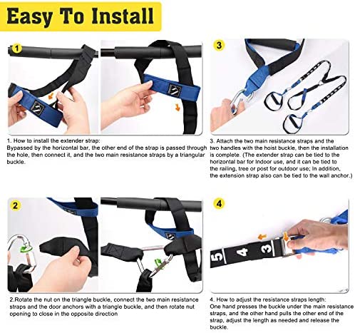 Durable Extender Strap – The home Resistance training straps come in an extender strap design. Attach them to a horizontal bar, tree, beam, or any sturdy and safe object. The durable and sturdy extender strap can be fixed quickly and will not slip. Start working out in seconds.(Please note that Door Anchor is Not included.)