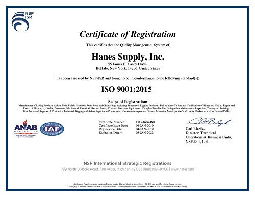 AMERICAN MADE RIGGING: Hanes Supply, Inc. is proud to be the industry-leading USA based manufacturer of hoisting solutions for industrial construction and building projects since 1930. All slings are manufactured in a certified ISO 9001: 2015 facility.