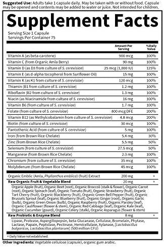 MULTIVITAMIN WITH PROBIOTICS & WHOLE FOODS: One a day women’s vitamins support energy, metabolism as well as radiant skin and nails; 24 powdered organically grown raw fruits and vegetables add supporting antioxidants, vitamins & nutrient cofactors
