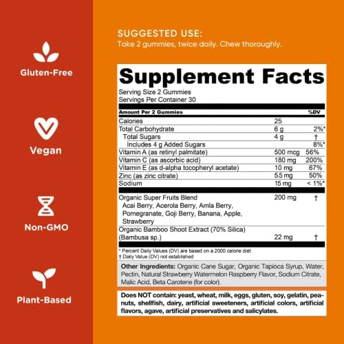 Essential Nutrients, Vitamins, and Great Taste: The unique combination of vitamins and botanicals found within Goli Superfruits Gummies help keep you on track with your beauty and wellness goals. Our formula contains Bamboo Silica and Vitamin C to aid with collagen formation all while helping skin maintain its health and appearance.