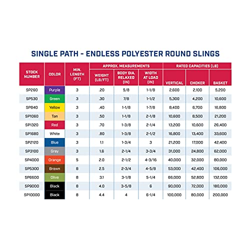 COLOR CODED CAPACITIES: A quick visual association of the color present allows for the user to determine the Working Load Limits for polyester slings. The load-bearing core yarn is covered by two similarly colored jackets.