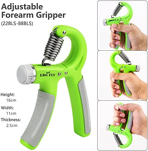 SUPER PACK HAND STRENGHENER Kit: Adjustable Hand Grip Strengthener (22-88 Lbs) + Finger Hand Exerciser (4 Lbs resistance each finger) + Finger Stretcher (Green 6.6bl, blue 8.8bl, orange 11bl)+ Exercise Ring (Green 30bl, blue 40bl, orange 50bl ) + Carrying/Storage/Protective Bag + Instruction Manual.