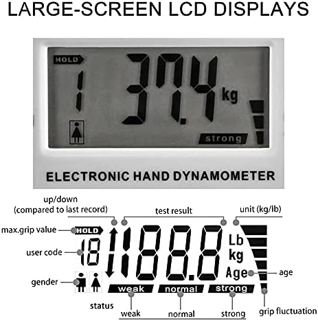 [LCD Display] – Large LCD screen shows all measurements clearly on the same screen. Displayed measurements include user code, age, gender, grip value in pound or kg, and grip status. A maximum grip value display and weak, normal or strong power levels can be saved and easily recalled for comparison.