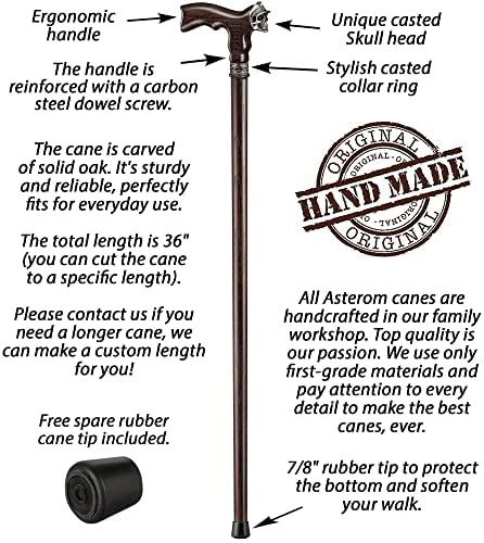 SIZE – The total length of the Skull walking stick is 36″, but you can cut it to a specific length if needed. If you want to get a custom size, please contact us before placing your order (it will take some time to make a custom cane for you).