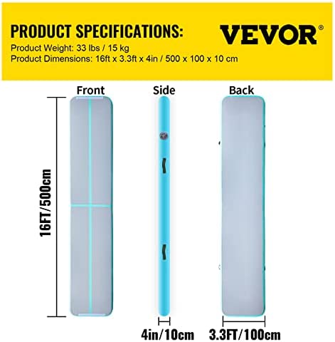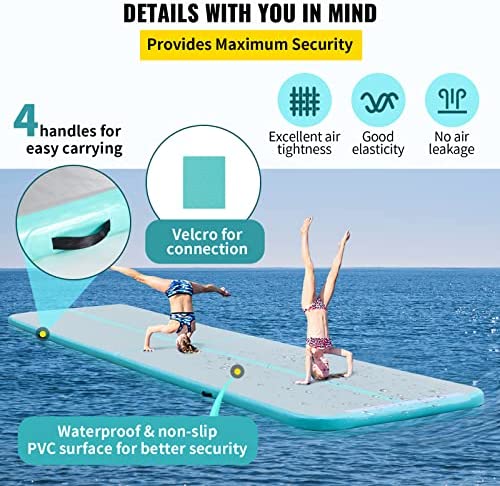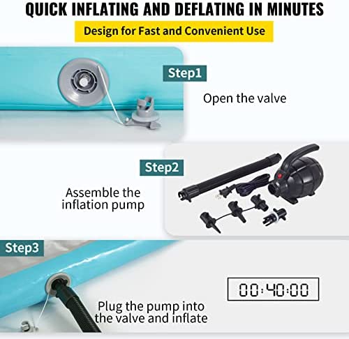 Easy to Inflate & Deflate: The package is equipped with a professional electric pump, the gymnastics track can be inflated or deflated within 1 minute. You can have fun the moment you receive our inflatable track. The valve is excellent leak-proof, allowing the gym mat to maintain its pressure for days. NOTE: Make sure the valve is closed after inflation.