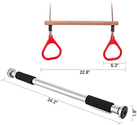 Durable Gym Bar,Swing Rope&Rings: the chrome-plated bar with rubber head is durable and rustless and it’s length can be adjusted from 24”/60 cm to 39”/99 cm, and it fits your doorway perfect.Swing Rope made of EVA material,Gymnastic rings combo is made of premium wood and plastics,this product can minimize sounds to average level,leaves children a quiet and comfortable experience while playing.