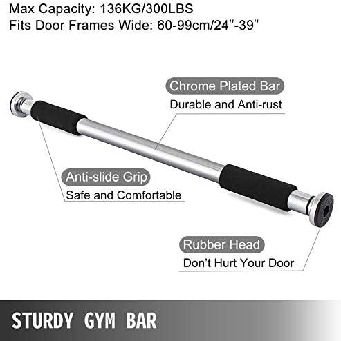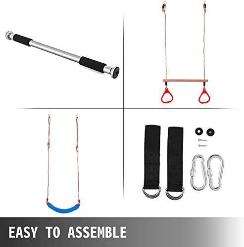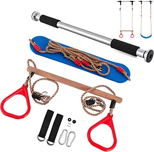 Various Accessories: This trapeze swing bar set includes a doorway gym bar, a gymnastic rings combo, and a rope swing. Playground trapeze bar with rings provides people swing and climb safely in indoors. For ages three and older. Please don’t swing too high in case of hitting the door frame.Max Capacity of the Gym Bar is: 136 KG/300 LBS.