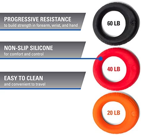 The Harbinger Ergo grip strength system is uniquely designed for fast and efficient whole hand and individual finger strength building at home or on the go. The ergonomic donut shape fits the natural shape of the hand, minimizing the risk of dropping the grips, and silicone provides a secure, non-slip surface for excellent control while strengthening the hands and fingers. The shape is designed to accommodate a range of hand sizes and work well for both men and women. The grips are lightweight and convenient for travel and are also easy to clean. With no springs or sharp parts and made from nontoxic silicone, they are very safe to use, even in homes with small children or pets. The Ergo grip strength system comes with three grips in different resistance levels, each a different, vibrant color. As hand and finger strength improves, progress from the 20-pound resistance grip to 40 and then 60 pounds of resistance.