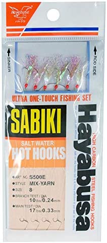 Ultra one -touch fishing set..Sabiki Set of 6 , Mix-Yarn, Red hooks in size 8. Complete with 66″ leader with swivels.