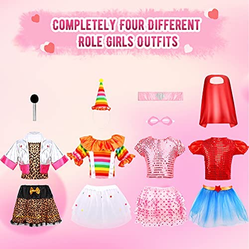 Our Girls Princess Dress up Trunk has 4 different role, you can choose to customize your own show like modern pop singer, happy carnival clown costume, pink blindfold super girl. red cape super girl, complete 4 kinds of fancy costumes for girls with different characters Surprise your girl with accessories!