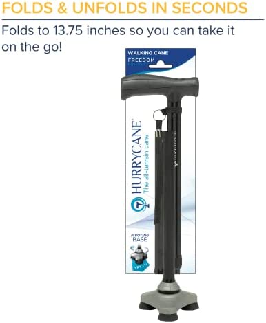 The #1 selling cane for women and men on Amazon just got better! This is the same walking cane for women and men that’s featured on National television! The Freedom Edition includes a re-designed foot locking system with a WhisperFlex base design, for a smooth and silent pivot. Inspired by the Most Advanced Machine on Earth: The Human Body. We built our canes for women and men from the ground up to feel like an extension of the body. Engineered with four critical innovations: 1. Stabilizes like a foot: Just like the human foot, our walking canes for men and women give you three points of contact for superior balance and stability. It naturally simulates your instinctive walking motion to provide you firm footing on any surface. Whether you’re sitting or standing, the SteadiGrip base gives you more traction at any angle. 2. Pivots like an ankle: The ankle is the most complex joint in the body because it has the trickiest job: Supporting your full weight while giving you the flexibility to walk, run, and turn on a dime. Our walking canes for women and men automatically pivot to help you maintain your balance on inclines, uneven ground, and shifting terrain. We designed our walk cane’s proprietary pivoting head to meet the same demanding standards – and it does it all, automatically. 3. Bends like a knee: Your knees bend to help you get in and out of restrictive places like cars. But our folding canes for women and men are even better: Instead of one joint, you get two! When you need to store our quad canes for women and men in a purse, glove box, or beneath a chair, the HurryCane folds up in seconds to one-third its normal size. And when you need, it flips out instantly. While our cane has two joints, it’s still strong and sturdy enough to be pressure-tested to support 350 pounds. 4. Changes in height: People come in all different heights. With just the push of a button, it instantly adjusts to eight convenient heights, ranging from 30.5” to 37.5″. To enhance your mobility experience add these HurryCane Accessories: HurryCane Replacement Feet the Heavenly Handle.