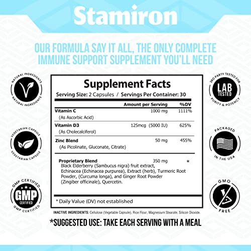 Proprietary Immune Defense Blend With Elderberry, Echinacea, Turmeric & Ginger – We added Turmeric Curcumin and a Ginger Supplement not only to reduce inflammation but also to increase absorption and bioavailability of all the ingredients in this product. Elderberry & Echinacea support immunity, cardiovascular heart health, skin health, and assist with daily stress & mood. Don’t leave your health up to chance, get protected with our easy to take all in 1 immune support blend today!