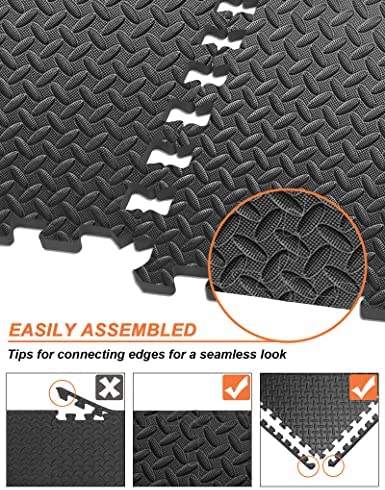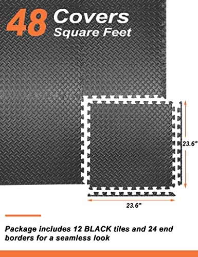 Workout Mat Covers 48 SQ. FT: Each foam floor tile measures 23.6 inches x 23.6 inches x 3/8 inch (600mm x 600mm x 10mm). Package includes 12 BLACK interlocking foam tiles and 24 end borders for a seamless look. Puzzle mats cover up to 48 sq.ft of floor space, making it a perfect workout and training accessory.
