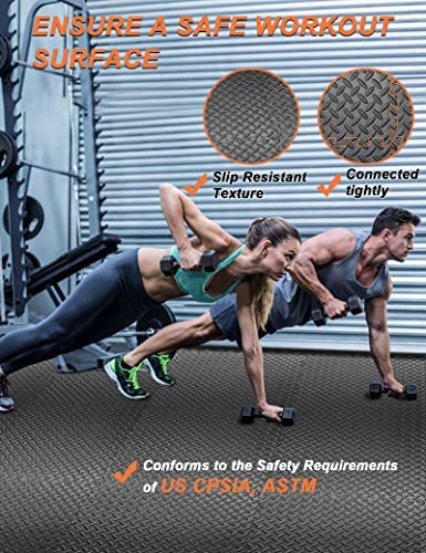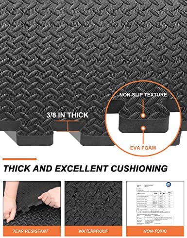 Durable Cushion and Multiple Uses: Each 3/8 inch thick foam floor mats are sturdy enough while providing a cushioned space. Each gym flooring mat is specially manufactured to make sure protection from rough and hard surfaces. Works great under heavy exercise machines to dampen vibration, reduce equipment noise, and protect your floor. Perfect exercise mats for home, gyms, workshops, garages, basement, fitness room or even children’s play areas.