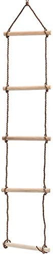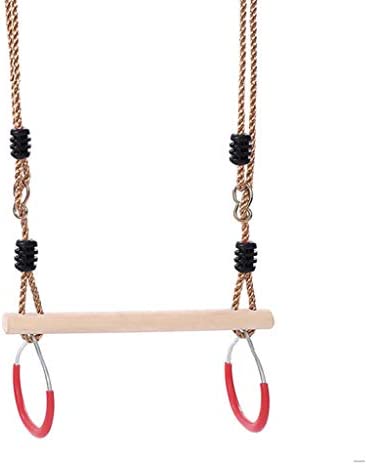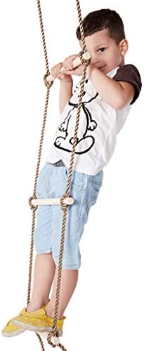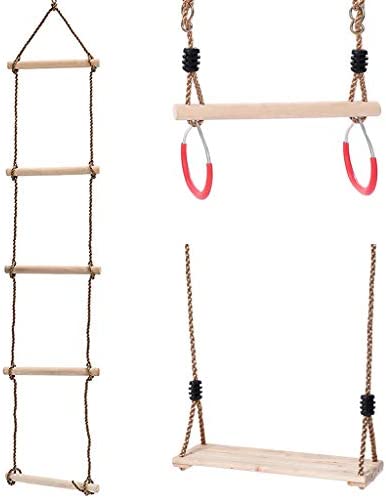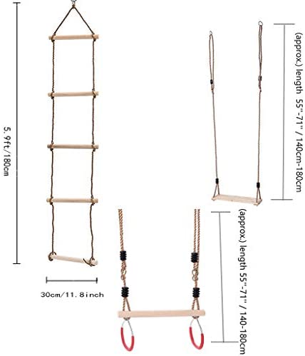 Contents Includes – a 5-layer climbing rope ladder, a wood trapeze bar with 2 steel rings and a wooden swing seat, 5 layers, each ladder 30cm in length, 2.2cm in diameter, with 1.8 m long PE rope, O-ring of the trapeze is 7*35mm, approx length:180cm/71in, Hanging Wood Swing Seat approx length: 2.1m/ 82.5 inch