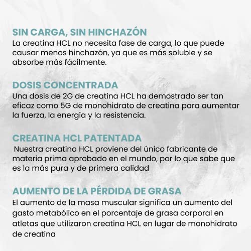 El clorhidrato de creatina (HCL) es una forma del suplemento dietético creatina al que se atribuyen varios beneficios potenciales. He aquí cuatro de los principales beneficios de la creatina HCL: Mejora del rendimiento en el ejercicio: La creatina HCL puede ayudar a mejorar el rendimiento del ejercicio al aumentar la disponibilidad de energía (ATP) en los músculos. Esto puede permitirle realizar más repeticiones durante el entrenamiento de resistencia, lo que puede conducir a un aumento de la fuerza muscular y el tamaño. Mejora la recuperación muscular: La creatina HCL puede ayudar a reducir el daño muscular y mejorar la recuperación muscular después del ejercicio intenso. Esto puede ayudarle a volver a sus entrenamientos más rápidamente y potencialmente mejorar el crecimiento muscular con el tiempo. Aumento de la masa muscular: Algunas investigaciones sugieren que tomar creatina HCL puede aumentar la masa muscular y la fuerza, especialmente cuando se combina con el entrenamiento de resistencia. Mejora de la función cerebral: Algunos estudios han encontrado que tomar creatina HCL puede mejorar la función cognitiva y la memoria, aunque se necesita más investigación para confirmar estos hallazgos.