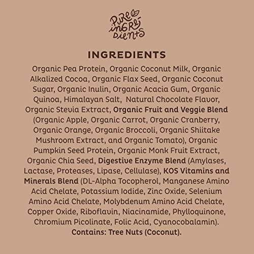 Organic Pea Protein, Organic Flax Seed, Organic Quinoa, Organic Pumpkin Seed Protein, Organic Chia Seed, Amylase, Protease, Lipase, Lactase, Cellulase, Organic Coconut Milk, Organic Cocoa Powder, Organic Inulin, Organic Coconut Sugar, Organic Acacia Fiber, Pink Sea Salt, Natural Plant-Based Chocolate Flavor, Organic Stevia,Tomato, Broccoli, Carrot, Shiitake Mushroom, Cranberry, Apple, Orange, Natural Monk Fruit Extract. Contains Tree Nuts