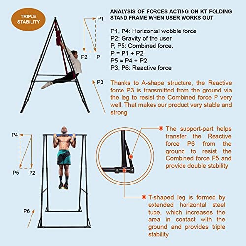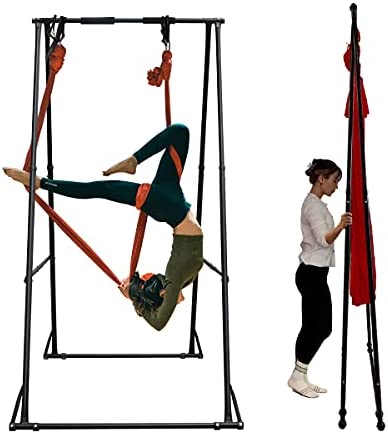 PORTABLE. Convenient and easy to move this KT fly yoga stand anywhere within your home/office and takes LESS THAN 10 SECONDS TO FOLD UP after use. Easy to add or remove other accessories beside aerial yoga hammock and kit such as foam handle grips, swing chair for kids, hammock chair, TRX straps.