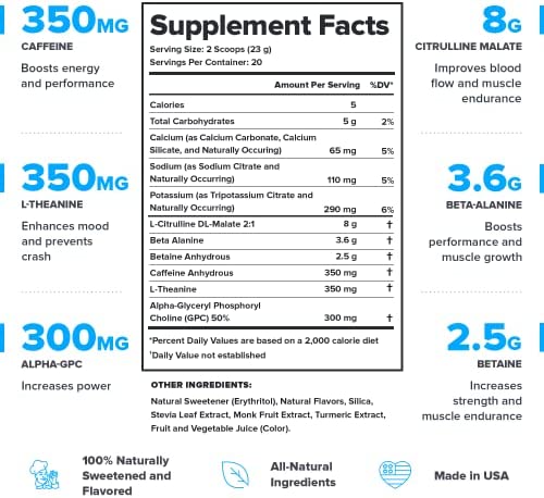 The caffeine and theanine gives you a surge of smooth energy and focus, the beta alanine and L citrulline malate boosts nitric oxide and gives you bigger and better pumps and more strength and endurance, and the betaine and alpha gpc increases strength and power.