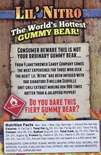 From Flamethrower Candy Company comes the next experience for those who seek the heat. Lil’ Nitro has been infused with our signature 9 million Scoville unit chili extract making him 900x hotter than a jalapeno pepper.
