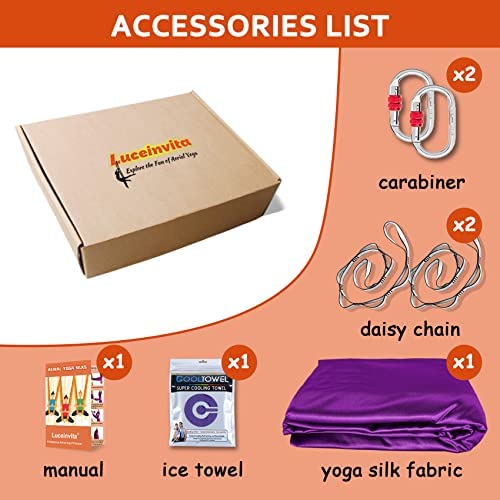 Package Includes: Aerial Yoga Hammock Set includes 1x yoga hammock fabric (L: 5.5 yards / W: 3 yards), 2x daisy chain(1 yard,23kn), 2x carabiner(25kn), 1x ice towel, 1x manual. (Note: The ceiling mount is not included.)