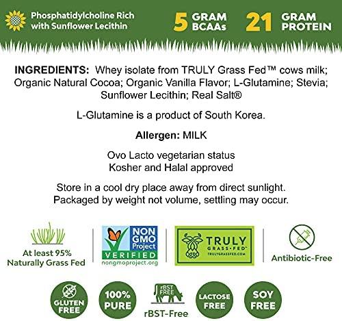 Whey isolate from TRULY Grass Fed™ cows milk; Organic Natural Cocoa; Organic Vanilla Flavor; L-Glutamine; Stevia; Sunflower Lecithin; Real Salt®