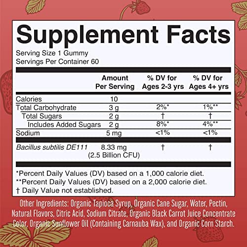 Per Serving (1 Gummy): 2.5 Billion CFU Bacillus subtilis. Other Ingredients: Organic Tapioca Syrup, Organic Cane Sugar, Natural Flavors, Pectin, Citric Acid, Sodium Citrate, Color Added (Organic Black Carrot Juice Concentrate), Organic Sunflower Oil (Containing Carnauba Wax), Organic Corn Starch.