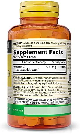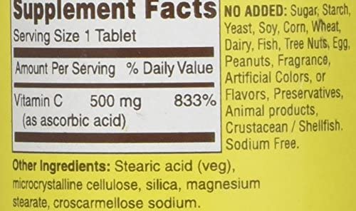 Our vitamin C tablets contain 560% of the Daily Value of vitamin C may help support immune health and immunity. Guaranteed to have no added sugar, starch, yeast, soy, corn, wheat, dairy, gluten, fish, tree nuts, peanuts, egg, fragrance, artificial colors or flavors, preservatives, animal products, crustacean shellfish. Sodium Free.