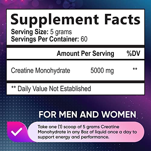For men and women. Take one (1) scoop of 5 grams Creatine Monohydrate in any 8oz of liquid once a day to support energy and performance.