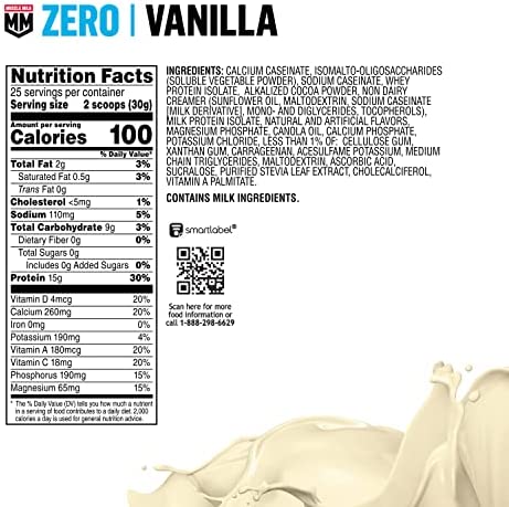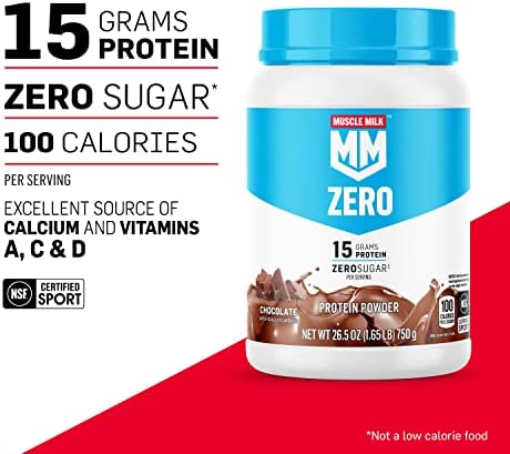 KEY FEATURES – Based on 1 serving, Muscle Milk Zero Protein Powder contains 15g high-quality protein, 100 calories, zero sugar, and an excellent source of Calcium and Vitamins A, C & D