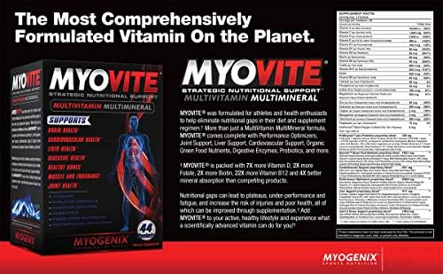 Myovite was formulated for athletes and health enthusiasts to help eliminate nutritional gaps in their diet and supplement regimen. More than just a MultiVitamin MultiMineral formula. MYOVITE comes complete with Performance Optimizers, Joint Support, Liver Support, Cardiovascular Support Organic Green Food Nutrients, Digestive Enzymes, Probiotics and more. Nutritional gaps can lead to plateaus, under-performance and fatigue, and increase the risk of injuries and poor health. All of these can be improved through supplementation. Add MYOVITE to your active, healthy lifestyle and experience what a scientifically advanced vitamin can do for you.