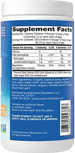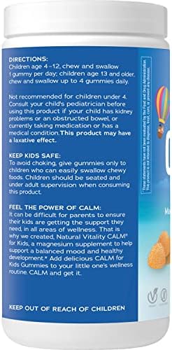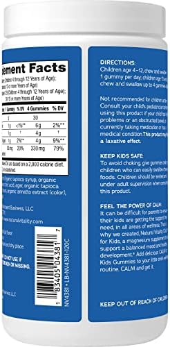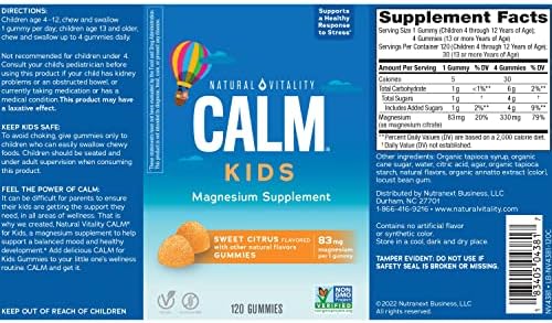 Natural Vitality CALM Kids Gummies are a kid-friendly magnesium supplement to support balanced mood and healthy development (1). Formulated with Magnesium Citrate, this supplement is gentler on the stomach and better absorbed than magnesium oxide. With 83 mg of magnesium per gummy, Natural CALM magnesium gummies for kids help support muscle, heart, brain and nervous system health while replenishing healthy magnesium levels (1). Vegan, gluten-free ingredients combine in these magnesium gummies to create a flavorful sweet citrus taste with only 1 gram of sugar per serving. Natural Vitality CALM gummies are Non-GMO Project Verified and contain no artificial flavor or synthetic color. (1) These statements have not been evaluated by the Food and Drug Administration. This product is not intended to diagnose, treat, cure or prevent any disease.