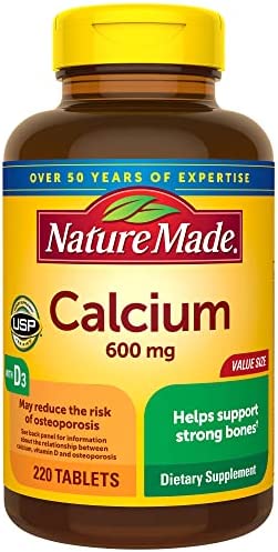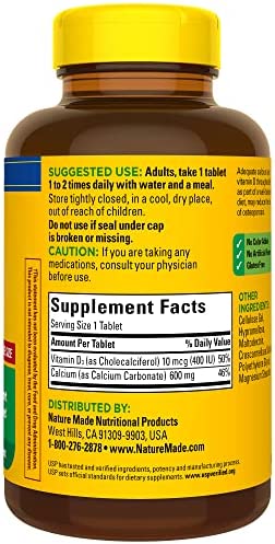 Nature Made Calcium 600 mg with Vitamin D3 Tablets are Calcium supplements formulated to help support bone strength. Sourced from high quality ingredients, these gluten free Nature Made Calcium 600mg with Vitamin D3 supplements contain no color added and no artificial flavors. This Calcium bone supplement also provides Vitamin D3, which helps improve Calcium absorption. This Nature Made 600 mg Calcium Vitamin D3 supplement is perfect for adults who are low in Calcium or want an additional dietary supplement with their diet. Adults, take one of these Calcium tablet bone supplements 1 to 2 times daily with water and a meal. Nature Made supplements are quality you can trust. USP has tested and verified ingredients, potency and manufacturing process. USP sets official standards for dietary supplements. Visit the USP verified website for more information.