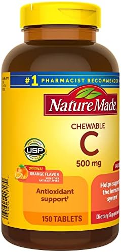 Nature Made Chewable Vitamin C 500 mg is a dietary supplement that helps support immune health, provides antioxidant support, and aids in iron absorption. Sourced from high-quality ingredients, this Vitamin C supplement has delicious orange-flavored Vitamin C chewable tablets with no color added and no artificial flavors. This is an antioxidant supplement with 500mg Vitamin C for adults. One Vitamin C tablet provides Vitamin C 500mg to support collagen synthesis and overall skin health. Adults, chew one Nature Made 500 mg Vitamin C tablet daily with a meal. Nature Made Vitamin C chewable supplements are quality you can trust. USP has tested and verified ingredients, potency, and manufacturing process. Made in the USA with quality global ingredients. USP sets official standards for dietary supplements. Visit the USP verified website for more information. *Based on a survey of pharmacists who recommend branded vitamins and supplements.