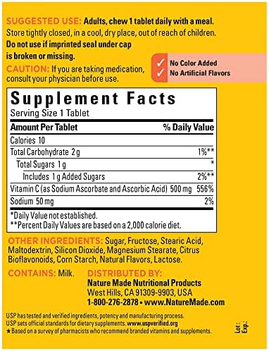 Back in original orange flavor; adults chew one of these Nature Made Vitamin C 500mg chewable tablets daily with a meal