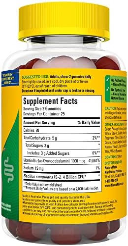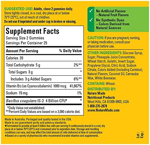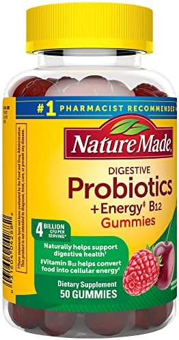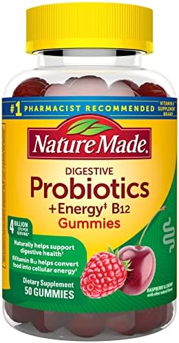Nature Made Digestive Probiotics and (1)Energy B12 Gummies for adults are dietary supplements that naturally help support digestive health. Each mens and womens probiotic gummy has a delicious fruit flavor. Sourced from high quality ingredients, this daily probiotic for women and men has no synthetic dyes-colors derived from natural sources, and no artificial flavors. These mens and womens probiotic gummies for adults also contain Vitamin B12, which supports energy metabolism(1). These probiotics for women gummies (and men) are shelf stable and formulated to deliver 4 billion CFUs per serving of 2 gummies until the end of their shelf life(3). Adults, chew two of these men and women probiotic gummies daily. Nature Made Probiotics for men and women are quality you can trust. (1)Helps convert food into cellular energy. (2)Formulated to provide at least 4 billion live cells per serving if continuously stored in a cool, dry place at or below 75°F (23°C) and consumed prior to expiration date. Storage and handling conditions can vary and may affect the total amount of cells delivered at time of consumption. (3)No refrigeration required. *Based on a survey of pharmacists who recommend branded vitamins and supplements.