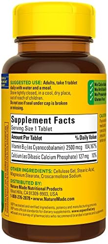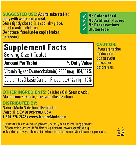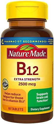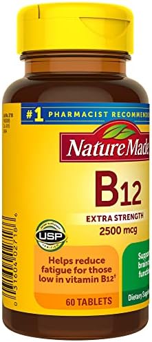 Nature Made Extra Strength Vitamin B12 2500 mcg Tablets help break down food into energy that your body can use all day long. Sourced from high quality ingredients, this gluten free B12 supplement is a dietary supplement that has no color added and no artificial flavors. This Nature Made B12 supplement helps support energy metabolism(1). B12 vitamins are important for vegetarians and vegans who may not consume enough from diet alone. Adults take one Nature Made Extra Stregnth 2500 mcg Vitamin B12 supplement daily with water and a meal. Nature Made supplements are quality you can trust. USP has tested and verified ingredients, potency and manufacturing process. USP sets official standards for dietary supplements. Visit the USP verified website for more information. (1)Helps convert food into cellular energy. *Based on a survey of pharmacists who recommend branded vitamins and supplements.