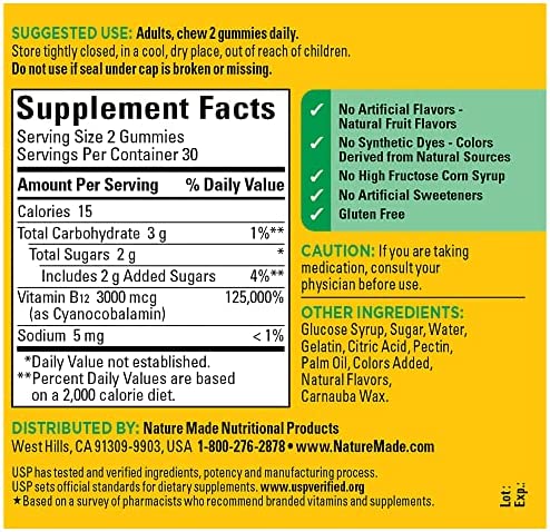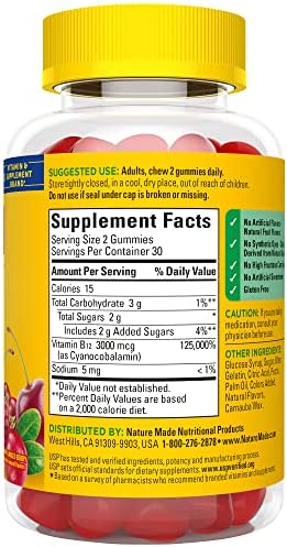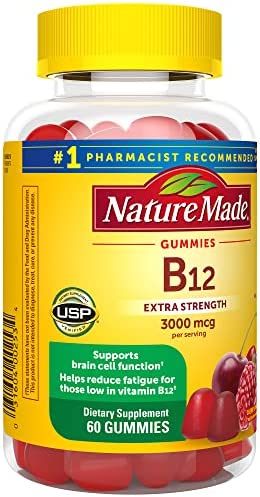 Nature Made Extra Strength Vitamin B12 Gummies with 3000 mcg B12 per serving are an enjoyable way to add B12 to your daily routine. Vitamin B 12 supports energy metabolism(1), supports brain cell function, and helps reduce fatigue for those low in B12. These gluten free Vitamin B12 gummies for adults have no artificial flavors, no synthetic dyes – colors derived from natural sources, no high fructose corn syrup, and no artificial sweeteners. B12 vitamins are important for vegetarians and vegans who may not consume enough Vitamin B12 foods in their diet. These Vitamin B12 gummies come in delicious cherry and mixed berry flavors with other natural flavors. Adults chew two Vit B12 gummies daily. Start your day with Nature Made B12 dietary supplements. USP has tested and verified ingredients, potency and manufacturing process. USP sets official standards for dietary supplements. Visit the USP verified website for more information. (1)Helps convert food into cellular energy. *Based on a 2022 survey of pharmacists who recommend branded vitamins and supplements. These statements have not been evaluated by the Food and Drug Administration. This product is not intended to diagnose, treat, cure, or prevent any disease.
