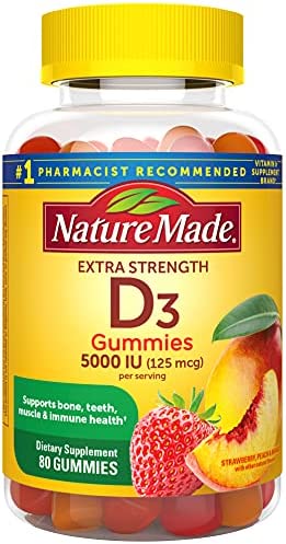 Nature Made Extra Strength Vitamin D3 5000 IU Gummies (125 mcg) per serving offer an easy way to add Vitamin D supplements to your daily routine to support bone, teeth, muscle, and immune health. Sourced from high quality ingredients, these Nature Made Vitamin D gummies for adults are gluten free dietary supplements with no synthetic dyes-colors derived from natural sources, no high fructose corn syrup, and no artificial sweeteners. These Vitamin D3 5000IU per serving gummy vitamins support a healthy immune response and aid in calcium absorption. Vitamin D is a common nutrient shortfall. D3 vitamin is the body’s preferred form of Vitamin D to help maintain Vit D levels. Featuring strawberry, peach, and mango with other natural flavors, these Extra Strength Nature Made Vitamin D3 supplements contain 125mcg (5000 IU) of Vit D3 per serving and are for those with higher Vitamin D needs and/or deficiency, as determined by a healthcare professional (1). Adults, chew two Vitamin D3 Nature Made gummies daily. This Nature Made Vitamin D supplement is quality you can trust. (1)Approximately 29% of U.S. adults are Vitamin D deficient (<50 nmol/L) *Based on a survey of pharmacists who recommend branded vitamins and supplements.