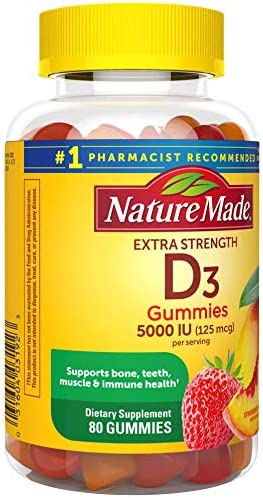 Nature Made Extra Strength Vitamin D 5000 IU per two gummies supports bone health, teeth health, muscle health, and provides immune support