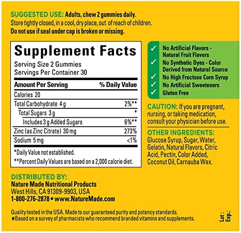 Nature Made Extra Strength Zinc 30 mg Gummies are a dietary supplement that supports immune health and offers antioxidant support. Sourced from high-quality ingredients, these gluten free Zinc supplement gummies contain no artificial flavors, no synthetic dyes, no high fructose corn syrup, and no artificial sweeteners. Zinc is an essential nutrient and plays a role as an antioxidant in numerous reactions in the body. This Nature Made Zinc 30 mg supplement supports a healthy immune system and helps support healthy skin. This 30 mg Zinc gummy supplement comes in delicious mixed berry and other natural fruit flavors. These dietary supplements are great for those looking to increase their daily zink intake, or people who prefer taking Zinc gummies adult instead of tablets. Adults, chew two of these gummies daily. Nature Made supplements are quality you can trust. *Based on a survey of pharmacists who recommend branded vitamins and supplements.